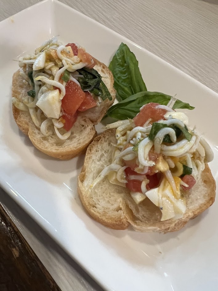 イタリアの定番おつまみ「ブルスケッタ」を、駿河湾でも親しまれているしらすと和の薬味でアレンジ。