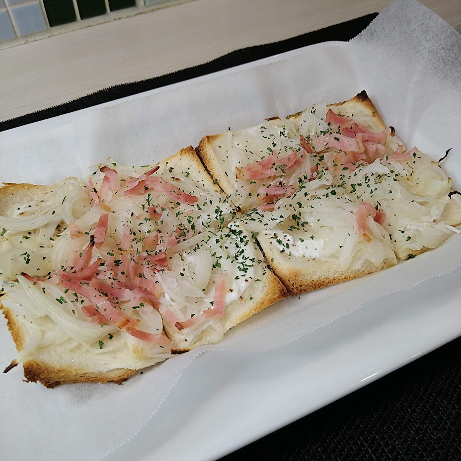 カリッと焼けた食パンの香ばしさに、玉ネギの甘み、ベーコンの旨み、ヨーグルトの優しい酸味が重なる、心ときめく一皿。
