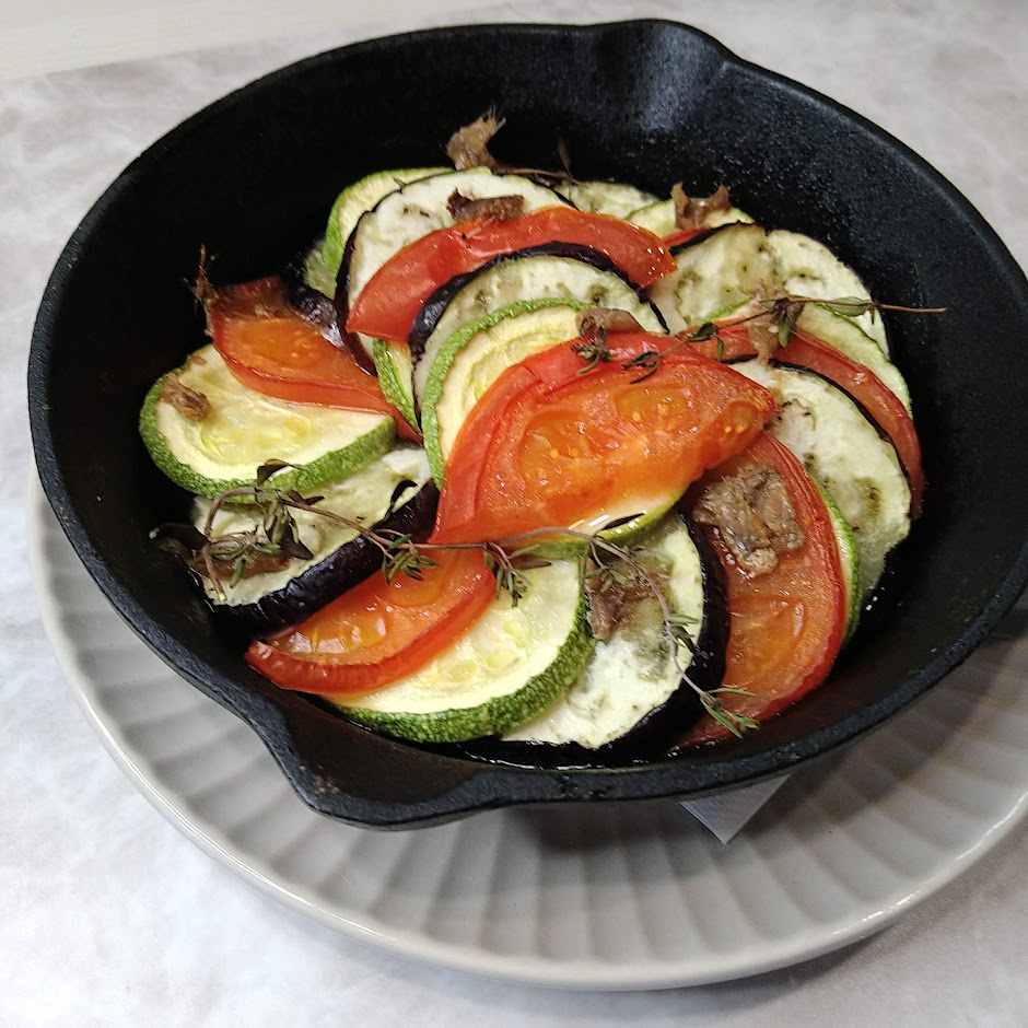 ズッキーニ、ナス、トマトの3つの夏野菜が、オーブンの中でじっくりと甘みを増し、お互いを引き立て合います。