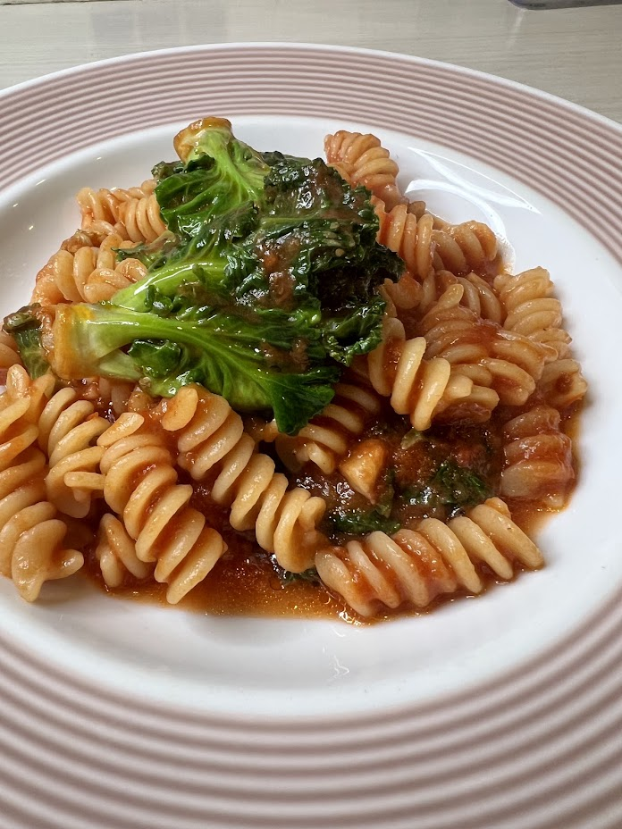 プチヴェールとアンチョビトマトソースのショートパスタ