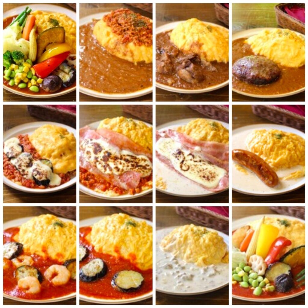 ランチの主役は、ふわとろのオムライス。デミグラス、カレー、クリーム、トマトの4種類のソースとトッピングの組み合わせでメニューは30種類以上!